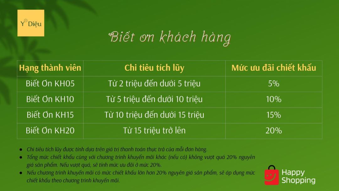 Anh chị sẽ trở thành thành viên của chương trình Y Diệu Biết Ơn ngay khi mua sản phẩm bất kỳ đầu tiên và sở hữu các mức chiết khấu dựa trên chi tiêu tích lũy mà đạt các mức hạng mức của chương trình.