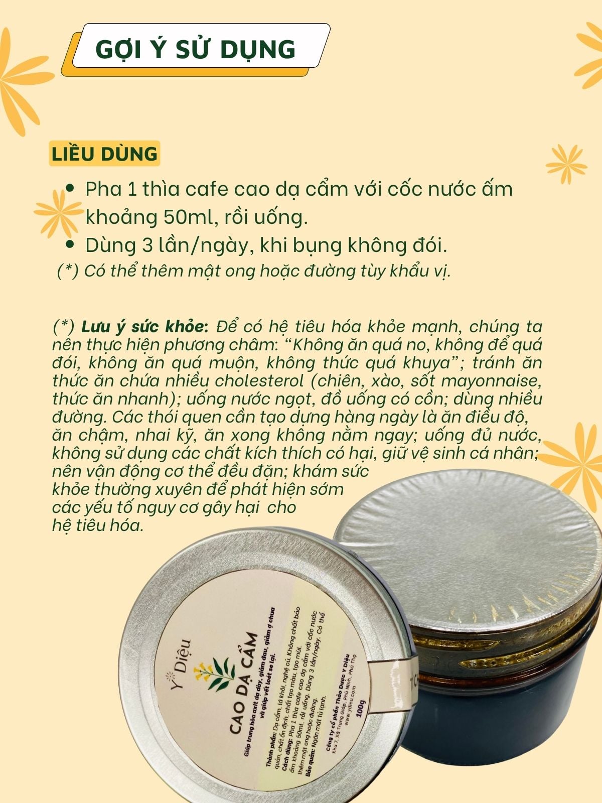 * Nếu khách có dấu hiệu lạnh bụng, người gầy, ốm, chán ăn, tiêu hóa kém, bụng yếu, đi ngoài lỏng nát, nên dùng kết hợp với sản phẩm Mật ong Yum Yum để giúp ăn ngon, tiêu hóa khỏe, chuyển hóa tốt.