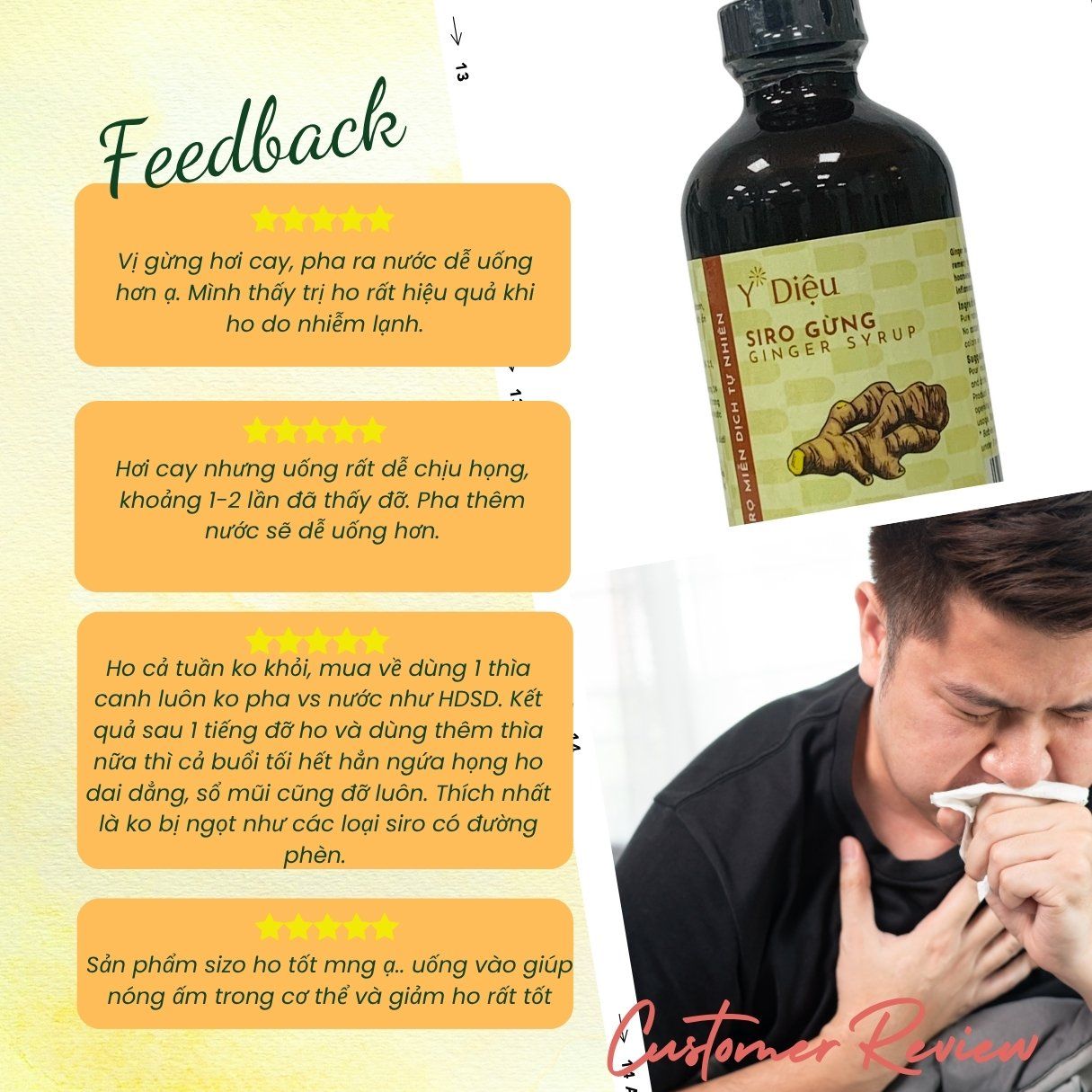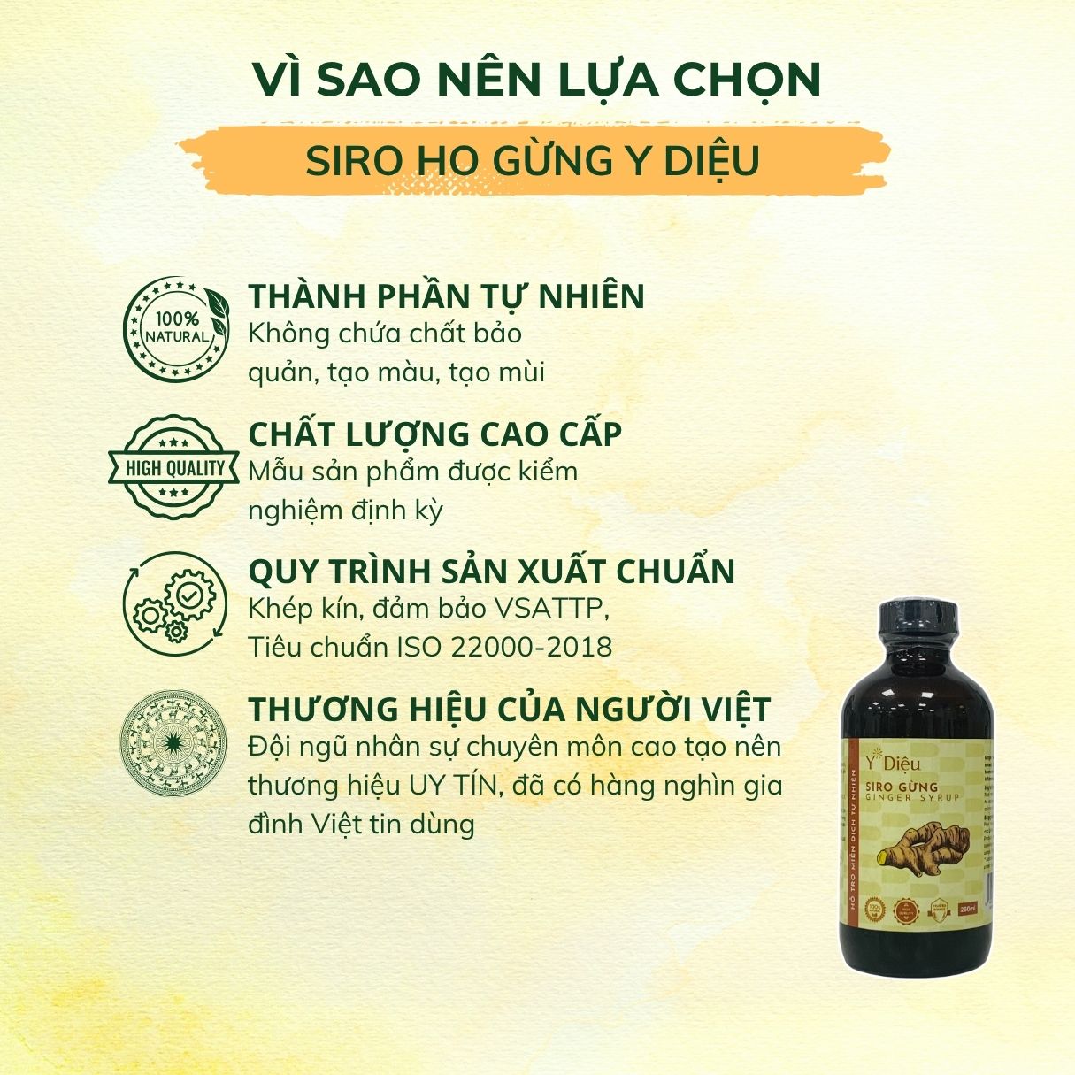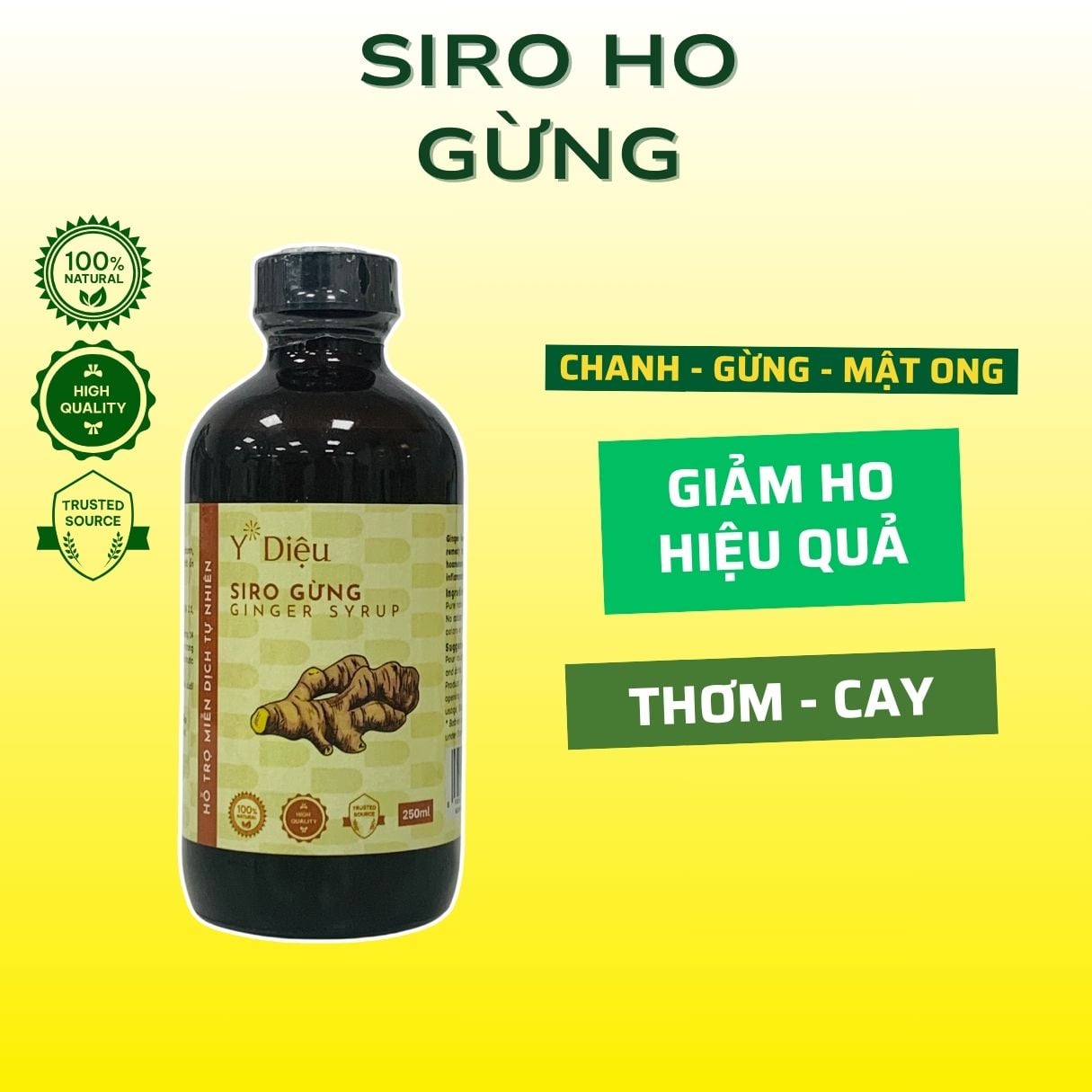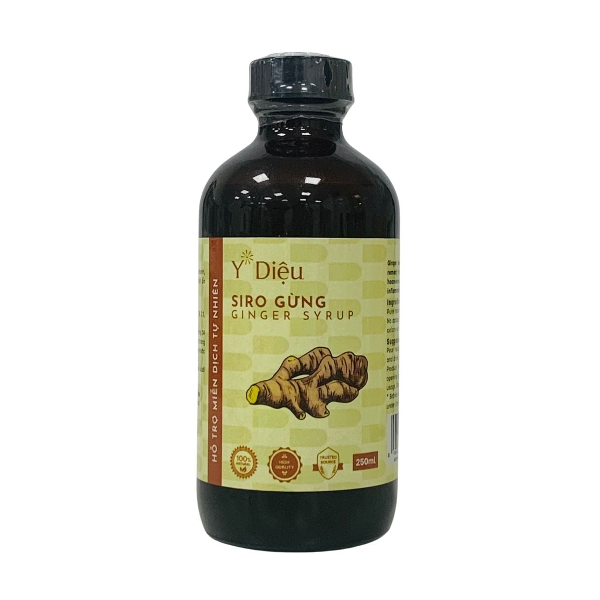 - Gừng tại Y Diệu được nhập từ xứ lạnh vùng cao Bắc Hà, Lào Cai với màu vàng óng, tính nóng, cay đặc biệt và hầu như không nhiễm chì. Y Diệu rửa sạch, nghiền nhỏ gừng trước khi được đưa vào chế biến thành thành phẩm Siro, nhờ đó phát huy tính ấm, cay và có vị rất thơm.